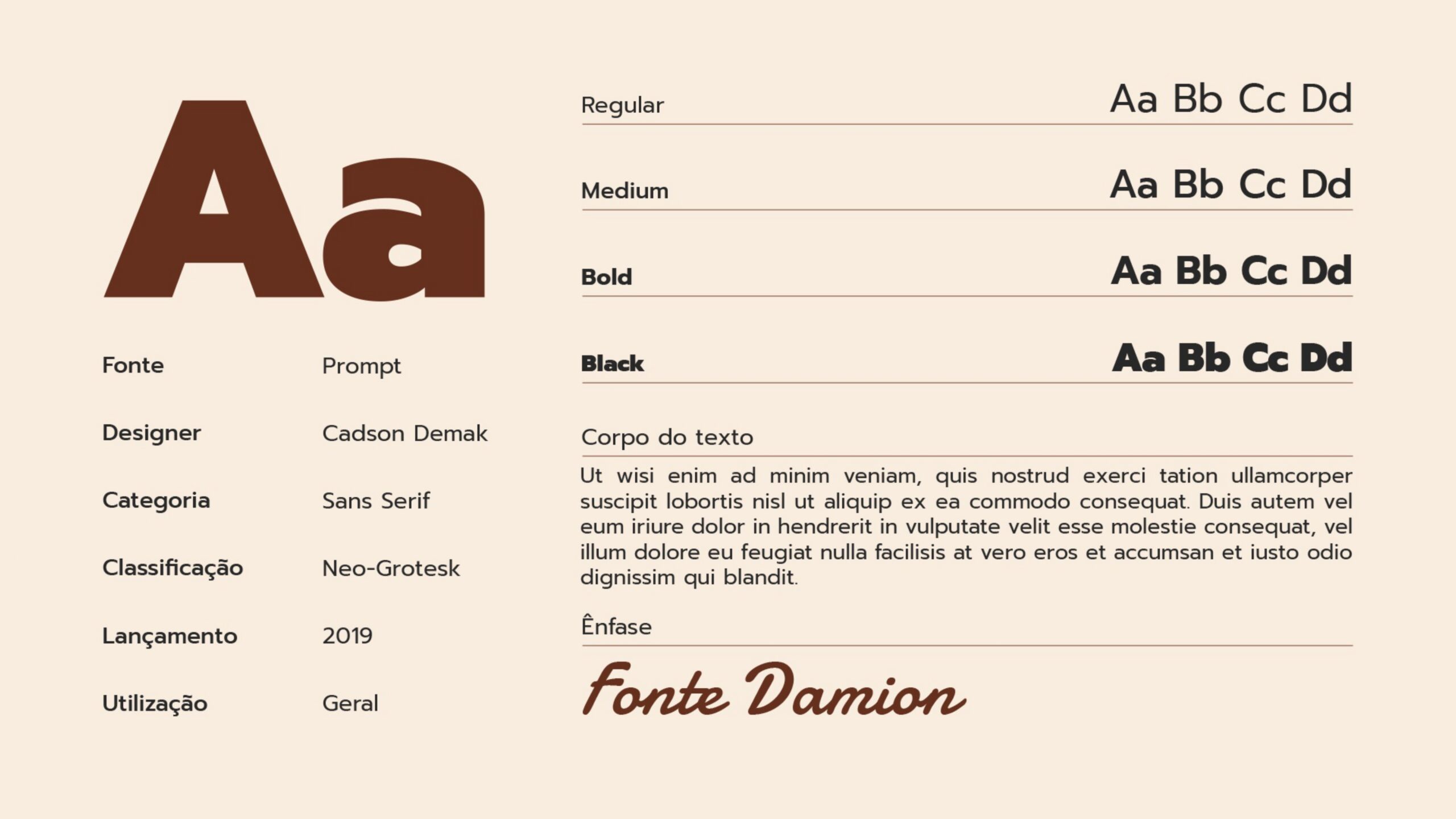Esse mesmo espírito de carisma e versatilidade também aparece na tipografia. Seguindo as boas práticas de aplicação da marca, recomenda-se que os títulos das peças utilizem a combinação das duas fontes principais — Prompt e Damion — trazendo contraste e personalidade às composições.